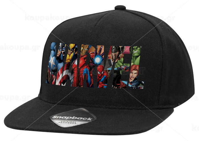 MARVEL characters, Adult Flat Snapback Hat Black, (100% COTTON TWILL, ADULT, UNISEX, ONE SIZE)