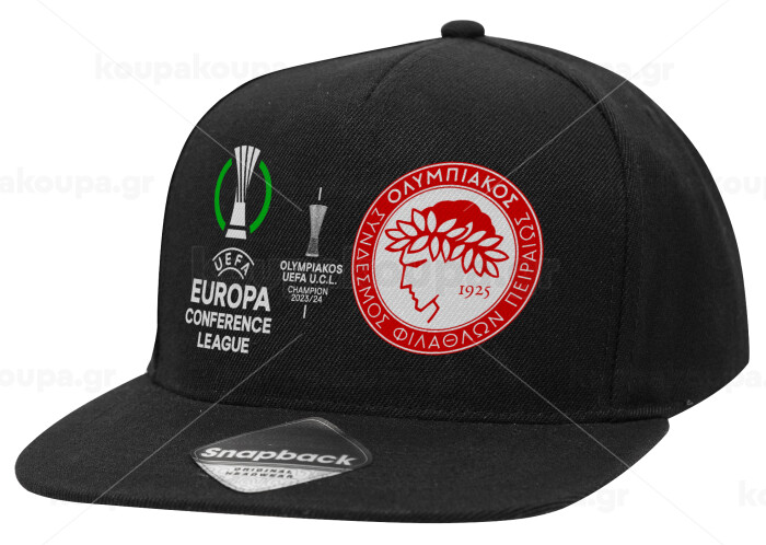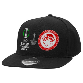 Olympiacos UEFA Europa Conference League Champion 2023/24, Adult Flat Snapback Hat Black, (100% COTTON TWILL, ADULT, UNISEX, ONE SIZE)