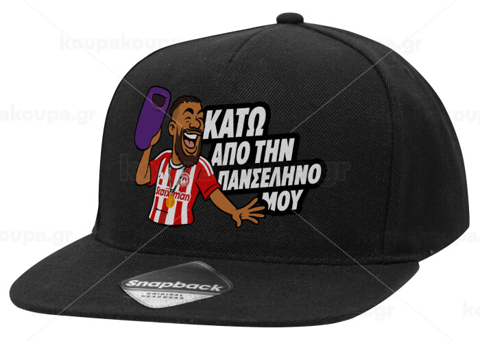 Ροντινέι, "ΚΑΤΩ ΑΠΟ ΤΗΝ ΠΑΝΣΕΛΗΝΟ ΜΟΥ!", Adult Flat Snapback Hat Black, (100% COTTON TWILL, ADULT, UNISEX, ONE SIZE)