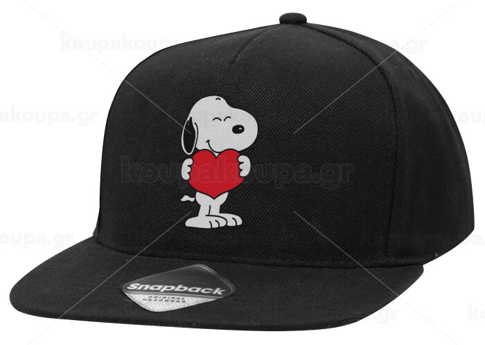 Snoopy takemy heart, Adult Flat Snapback Hat Black, (100% COTTON TWILL, ADULT, UNISEX, ONE SIZE)