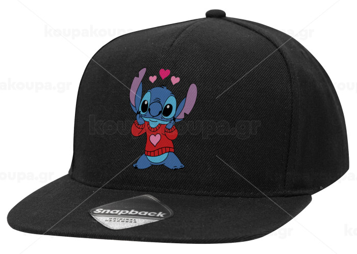 Stitch heart, Adult Flat Snapback Hat Black, (100% COTTON TWILL, ADULT, UNISEX, ONE SIZE)