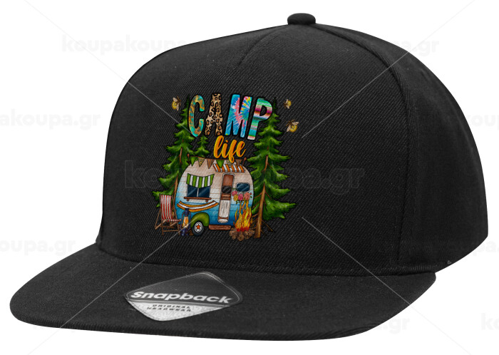 Camp Life, Adult Flat Snapback Hat Black, (100% COTTON TWILL, ADULT, UNISEX, ONE SIZE)