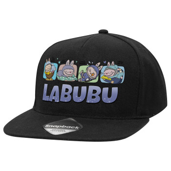 Labubu, Adult Flat Snapback Hat Black, (100% COTTON TWILL, ADULT, UNISEX, ONE SIZE)