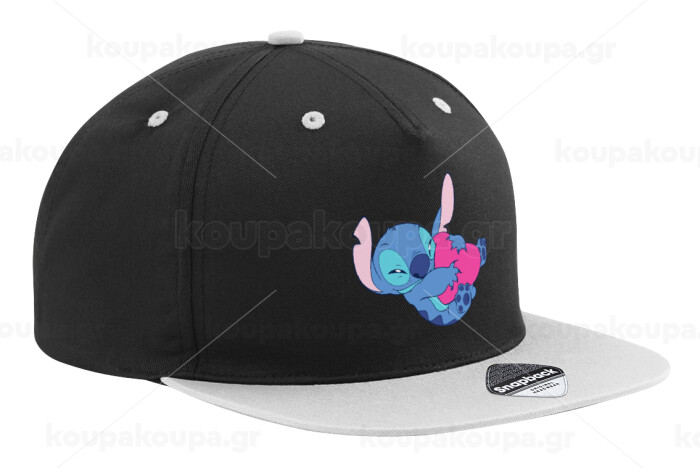 Lilo & Stitch hugs and hearts, Adult Flat Snapback Hat Black/Grey, (100% COTTON TWILL, ADULT, UNISEX, ONE SIZE)