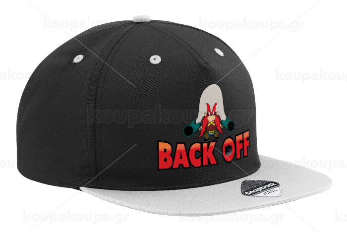 Yosemite Sam Back OFF, Adult Flat Snapback Hat Black/Grey, (100% COTTON TWILL, ADULT, UNISEX, ONE SIZE)