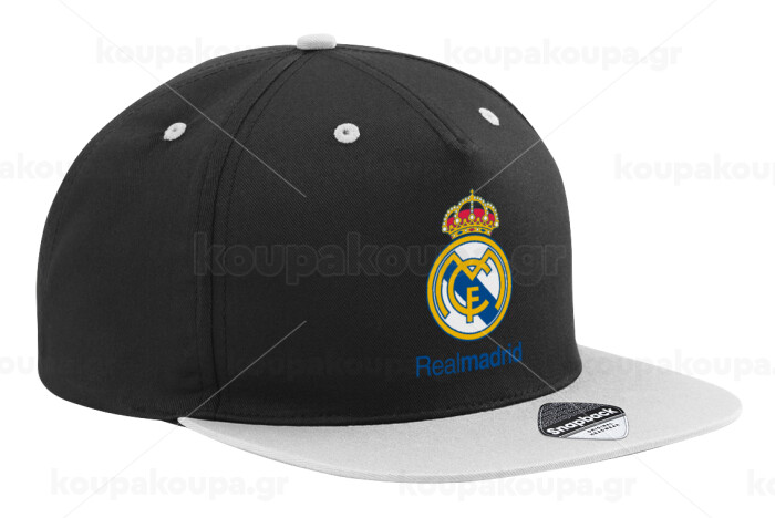 Real Madrid CF, Adult Flat Snapback Hat Black/Grey, (100% COTTON TWILL, ADULT, UNISEX, ONE SIZE)