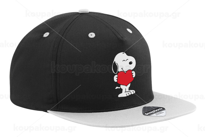 Snoopy takemy heart, Adult Flat Snapback Hat Black/Grey, (100% COTTON TWILL, ADULT, UNISEX, ONE SIZE)