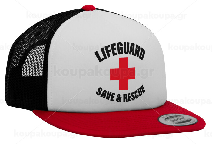 Lifeguard Save & Rescue, Adult Foam Flat Snapback with Mesh Red-White-Black (POLYESTER, ADULT, UNISEX, ONE SIZE)