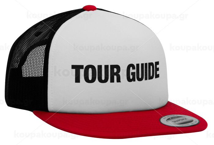 Tour Guide, Adult Foam Flat Snapback with Mesh Red-White-Black (POLYESTER, ADULT, UNISEX, ONE SIZE)