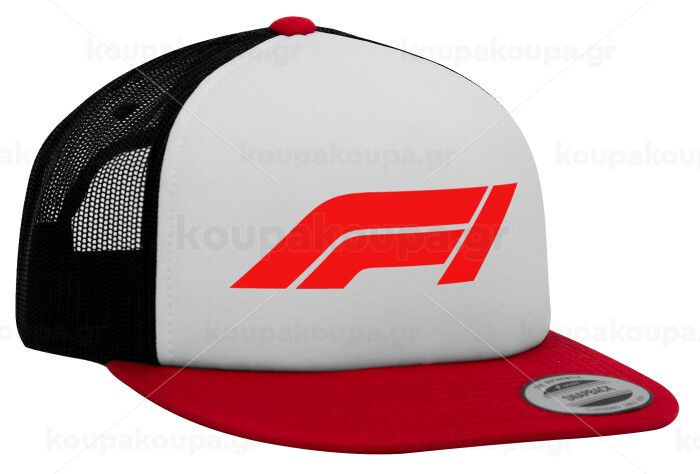 Formula 1, Adult Foam Flat Snapback with Mesh Red-White-Black (POLYESTER, ADULT, UNISEX, ONE SIZE)