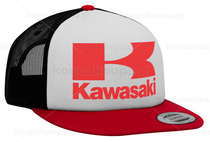 Kawasaki, Adult Foam Flat Snapback with Mesh Red-White-Black (POLYESTER, ADULT, UNISEX, ONE SIZE)