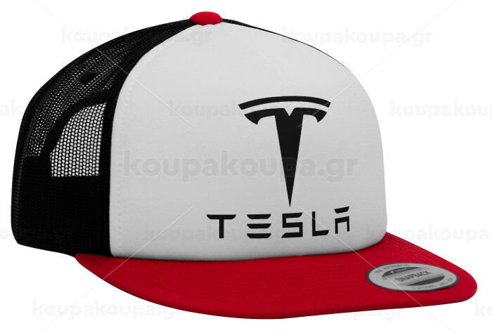 Tesla motors, Adult Foam Flat Snapback with Mesh Red-White-Black (POLYESTER, ADULT, UNISEX, ONE SIZE)