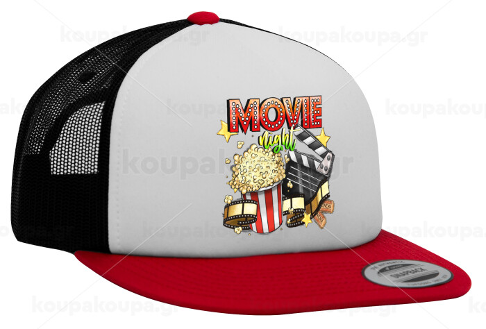 Movie night, Adult Foam Flat Snapback with Mesh Red-White-Black (POLYESTER, ADULT, UNISEX, ONE SIZE)