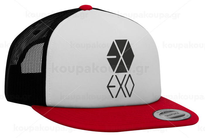 EXO Band korea, Adult Foam Flat Snapback with Mesh Red-White-Black (POLYESTER, ADULT, UNISEX, ONE SIZE)