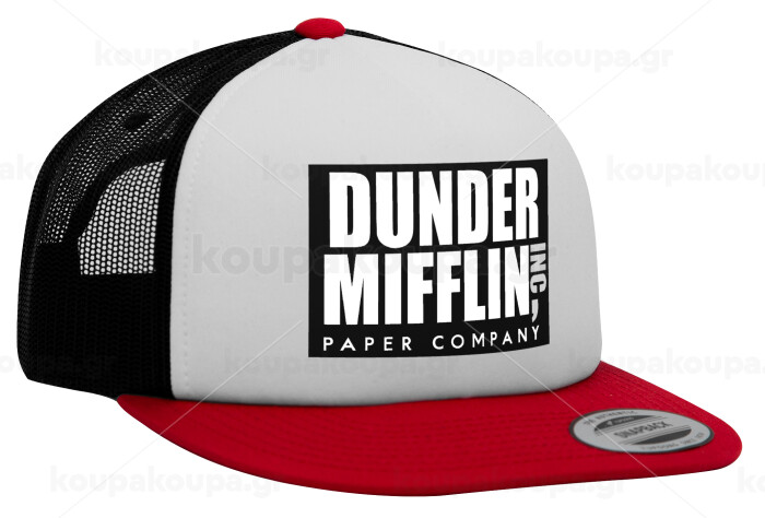 Dunder Mifflin, Inc Paper Company, Adult Foam Flat Snapback with Mesh Red-White-Black (POLYESTER, ADULT, UNISEX, ONE SIZE)