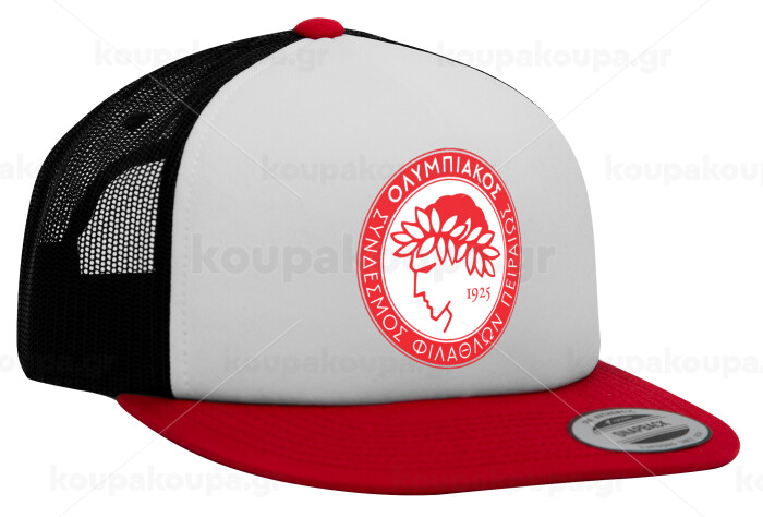 Ολυμπιακός, Adult Foam Flat Snapback with Mesh Red-White-Black (POLYESTER, ADULT, UNISEX, ONE SIZE)