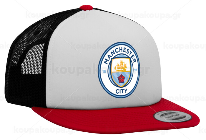 Manchester City FC , Adult Foam Flat Snapback with Mesh Red-White-Black (POLYESTER, ADULT, UNISEX, ONE SIZE)