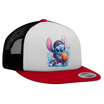 Stitch Basketball, Adult Foam Flat Snapback with Mesh Red-White-Black (POLYESTER, ADULT, UNISEX, ONE SIZE)
