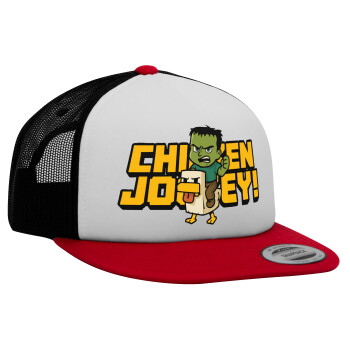 Chicken Jockey, Adult Foam Flat Snapback with Mesh Red-White-Black (POLYESTER, ADULT, UNISEX, ONE SIZE)