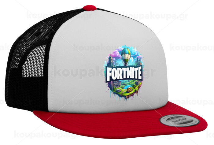 Fortnite land, Adult Foam Flat Snapback with Mesh Red-White-Black (POLYESTER, ADULT, UNISEX, ONE SIZE)