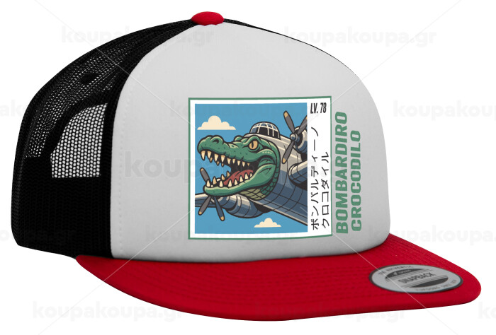 Bombardiro Crocodilo, Adult Foam Flat Snapback with Mesh Red-White-Black (POLYESTER, ADULT, UNISEX, ONE SIZE)