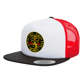 cobra kai strike first dojo, Adult Foam Flat Snapback with Mesh Black-White-Red (POLYESTER, ADULT, UNISEX, ONE SIZE)