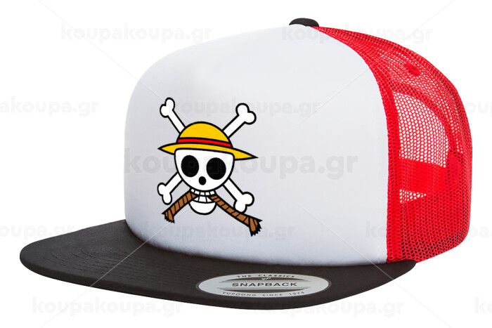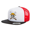 Onepiece skull, Adult Foam Flat Snapback with Mesh Black-White-Red (POLYESTER, ADULT, UNISEX, ONE SIZE)