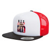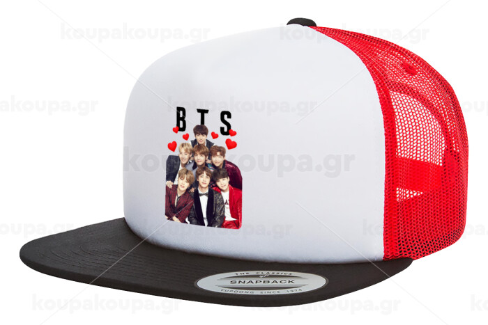 BTS hearts, Adult Foam Flat Snapback with Mesh Black-White-Red (POLYESTER, ADULT, UNISEX, ONE SIZE)