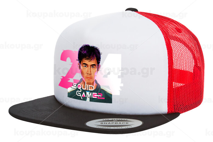 Squid game 456 Gi-Hun, Adult Foam Flat Snapback with Mesh Black-White-Red (POLYESTER, ADULT, UNISEX, ONE SIZE)