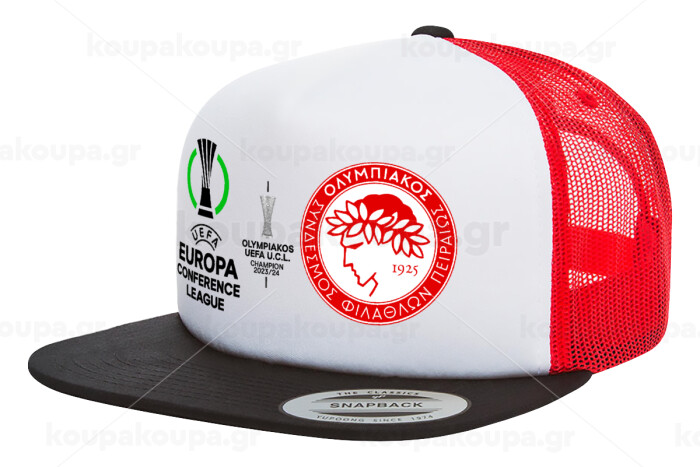 Olympiacos UEFA Europa Conference League Champion 2023/24, Adult Foam Flat Snapback with Mesh Black-White-Red (POLYESTER, ADULT, UNISEX, ONE SIZE)