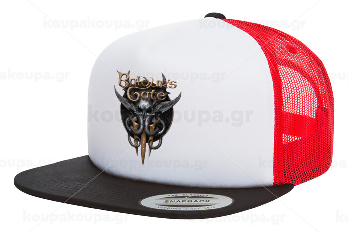 Baldur's Gate, Adult Foam Flat Snapback with Mesh Black-White-Red (POLYESTER, ADULT, UNISEX, ONE SIZE)