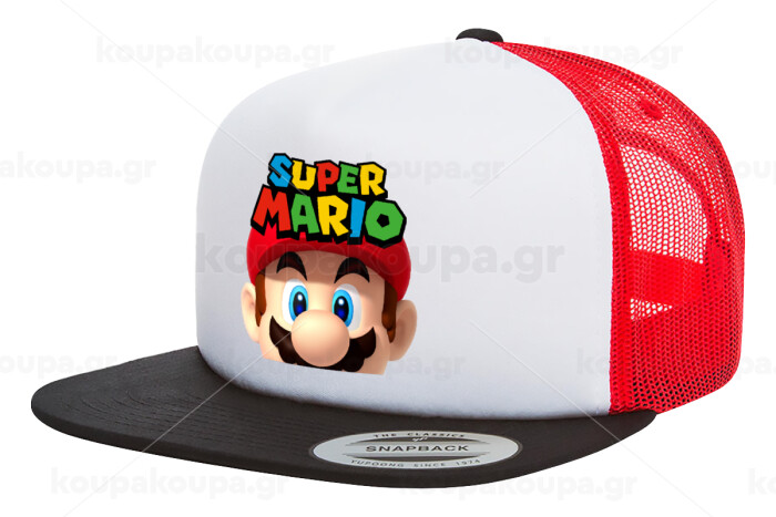 Super mario, Adult Foam Flat Snapback with Mesh Black-White-Red (POLYESTER, ADULT, UNISEX, ONE SIZE)