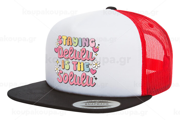 Delulu, Adult Foam Flat Snapback with Mesh Black-White-Red (POLYESTER, ADULT, UNISEX, ONE SIZE)