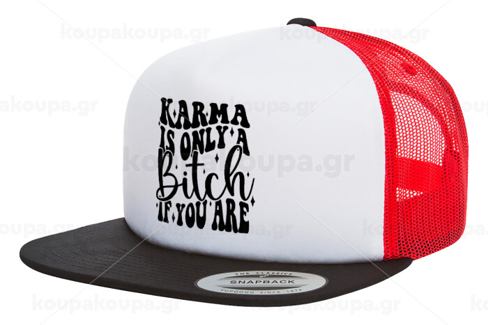 Karma is Only A Bitch if You Are, Adult Foam Flat Snapback with Mesh Black-White-Red (POLYESTER, ADULT, UNISEX, ONE SIZE)