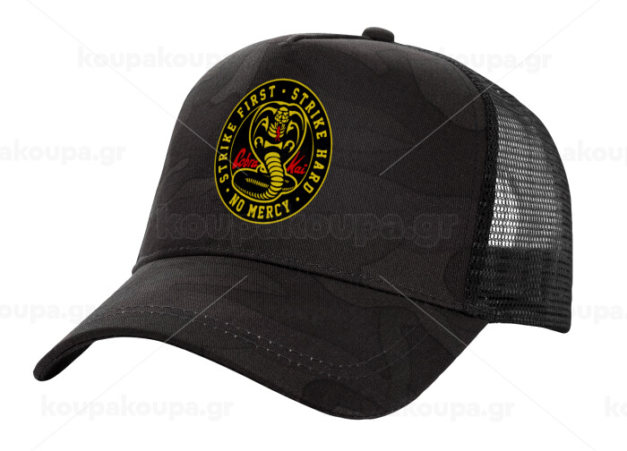 cobra kai strike first dojo, Adult Structured Trucker Hat, with Mesh, Dark Army (100% COTTON, ADULT, UNISEX, ONE SIZE)