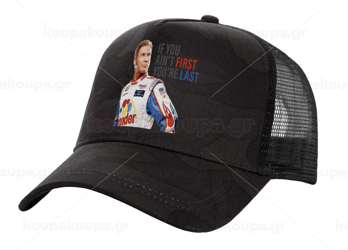 If You Ain't First You're Last Ricky Bobby, Talladega Nights, Adult Structured Trucker Hat, with Mesh, Dark Army (100% COTTON, ADULT, UNISEX, ONE SIZE)