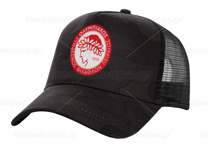 Ολυμπιακός, Adult Structured Trucker Hat, with Mesh, Dark Army (100% COTTON, ADULT, UNISEX, ONE SIZE)