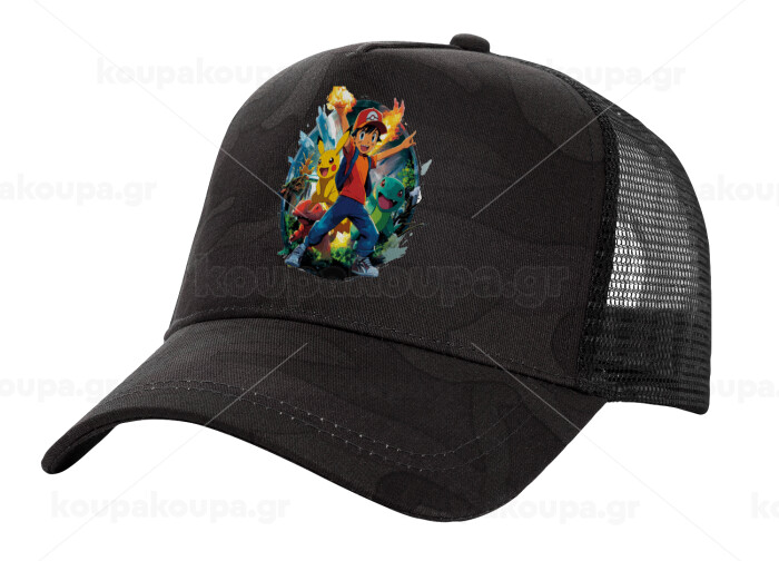 Ash Ketchum & Pikachu, Adult Structured Trucker Hat, with Mesh, Dark Army (100% COTTON, ADULT, UNISEX, ONE SIZE)