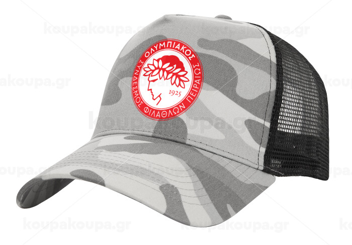 Ολυμπιακός, Adult Structured Trucker Hat, with Mesh, (Camouflage) Army Camo (100% COTTON, ADULT, UNISEX, ONE SIZE)
