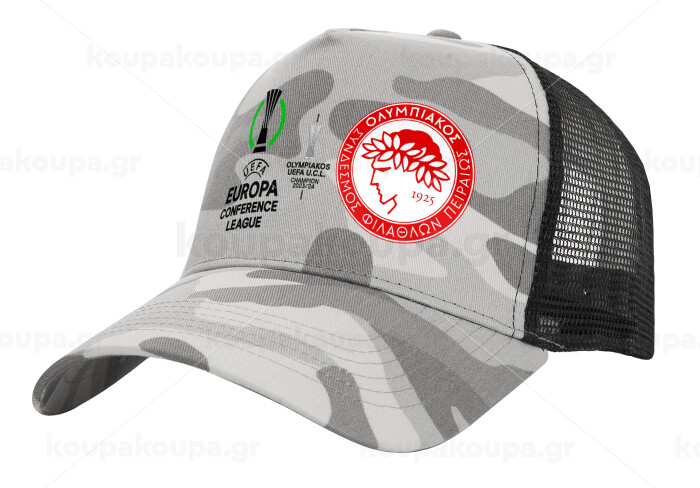 Olympiacos UEFA Europa Conference League Champion 2023/24, Adult Structured Trucker Hat, with Mesh, (Camouflage) Army Camo (100% COTTON, ADULT, UNISEX, ONE SIZE)