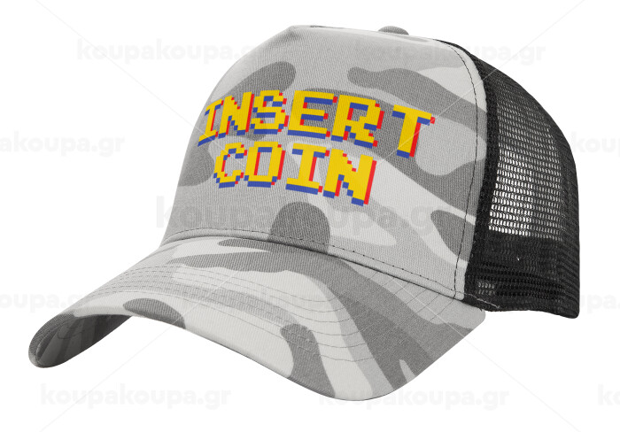 Insert coin!!!, Adult Structured Trucker Hat, with Mesh, (Camouflage) Army Camo (100% COTTON, ADULT, UNISEX, ONE SIZE)