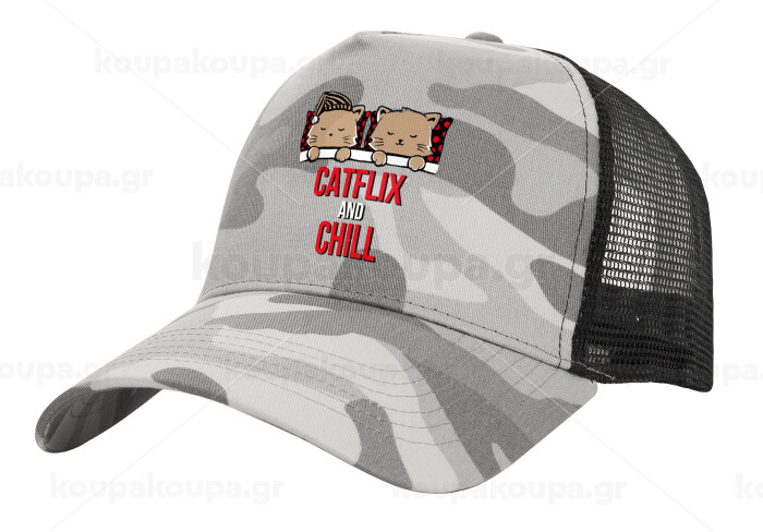 Catflix and Chill, Adult Structured Trucker Hat, with Mesh, (Camouflage) Army Camo (100% COTTON, ADULT, UNISEX, ONE SIZE)