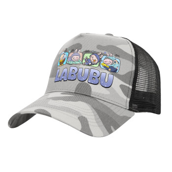 Labubu, Adult Structured Trucker Hat, with Mesh, (Camouflage) Army Camo (100% COTTON, ADULT, UNISEX, ONE SIZE)