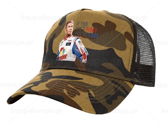 If You Ain't First You're Last Ricky Bobby, Talladega Nights, Adult Structured Trucker Hat, with Mesh, (Camouflage) Army (100% COTTON, ADULT, UNISEX, ONE SIZE)