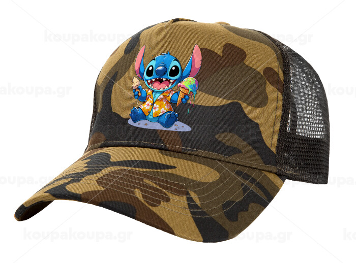 Stitch Ice cream, Adult Structured Trucker Hat, with Mesh, (Camouflage) Army (100% COTTON, ADULT, UNISEX, ONE SIZE)