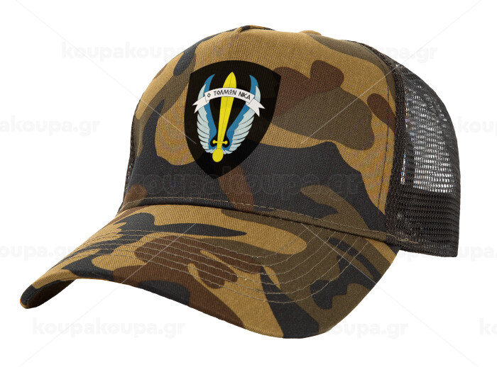 Έμβλημα Μονάδων Καταδρομών Ο Τολμων Νικα - Λοκ, Adult Structured Trucker Hat, with Mesh, (Camouflage) Army (100% COTTON, ADULT, UNISEX, ONE SIZE)