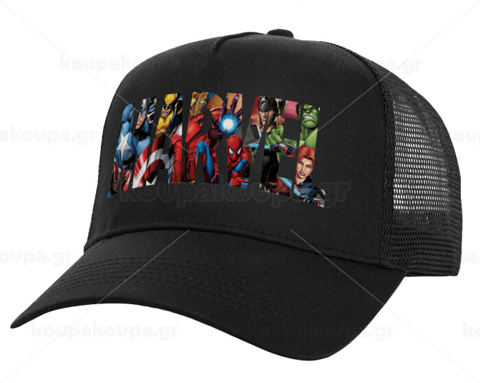 MARVEL characters, Structured Trucker Adult Hat, with Mesh, Black (100% COTTON, ADULT, UNISEX, ONE SIZE)