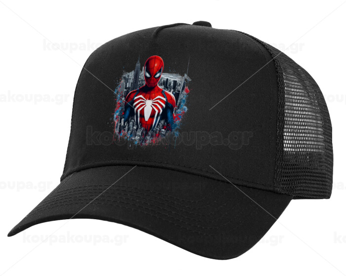 Spiderman City, Structured Trucker Adult Hat, with Mesh, Black (100% COTTON, ADULT, UNISEX, ONE SIZE)