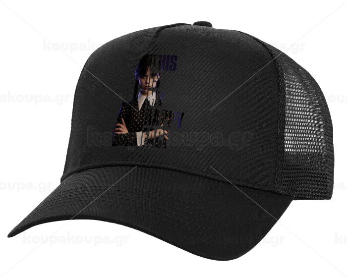 Wednesday, This is my happy face, Structured Trucker Adult Hat, with Mesh, Black (100% COTTON, ADULT, UNISEX, ONE SIZE)