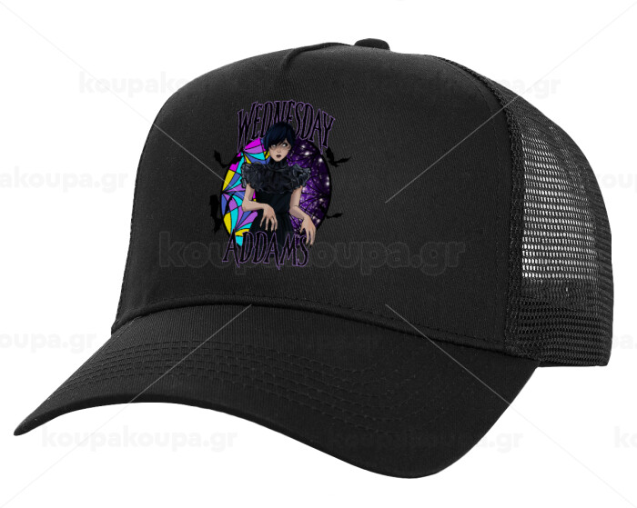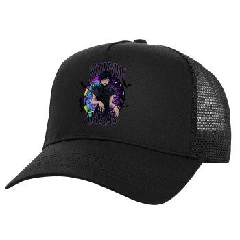 Wednesday Jenna Ortega, Structured Trucker Adult Hat, with Mesh, Black (100% COTTON, ADULT, UNISEX, ONE SIZE)
